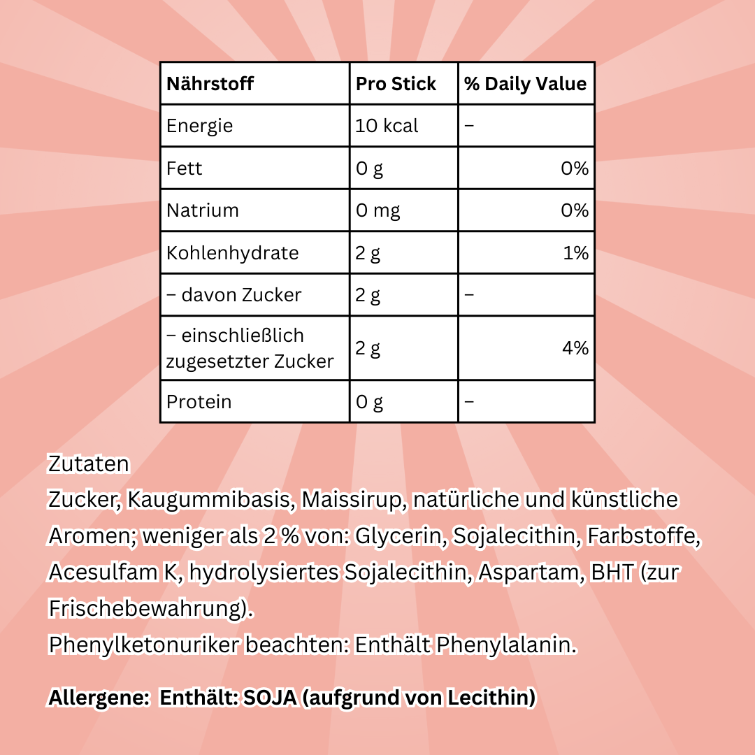 Zucker, Kaugummibasis, Maissirup, natürliche und künstliche Aromen; weniger als 2 % von: Glycerin, Sojalecithin, Farbstoffe, Acesulfam K, hydrolysiertes Sojalecithin, Aspartam, BHT (zur Frischebewahrung).