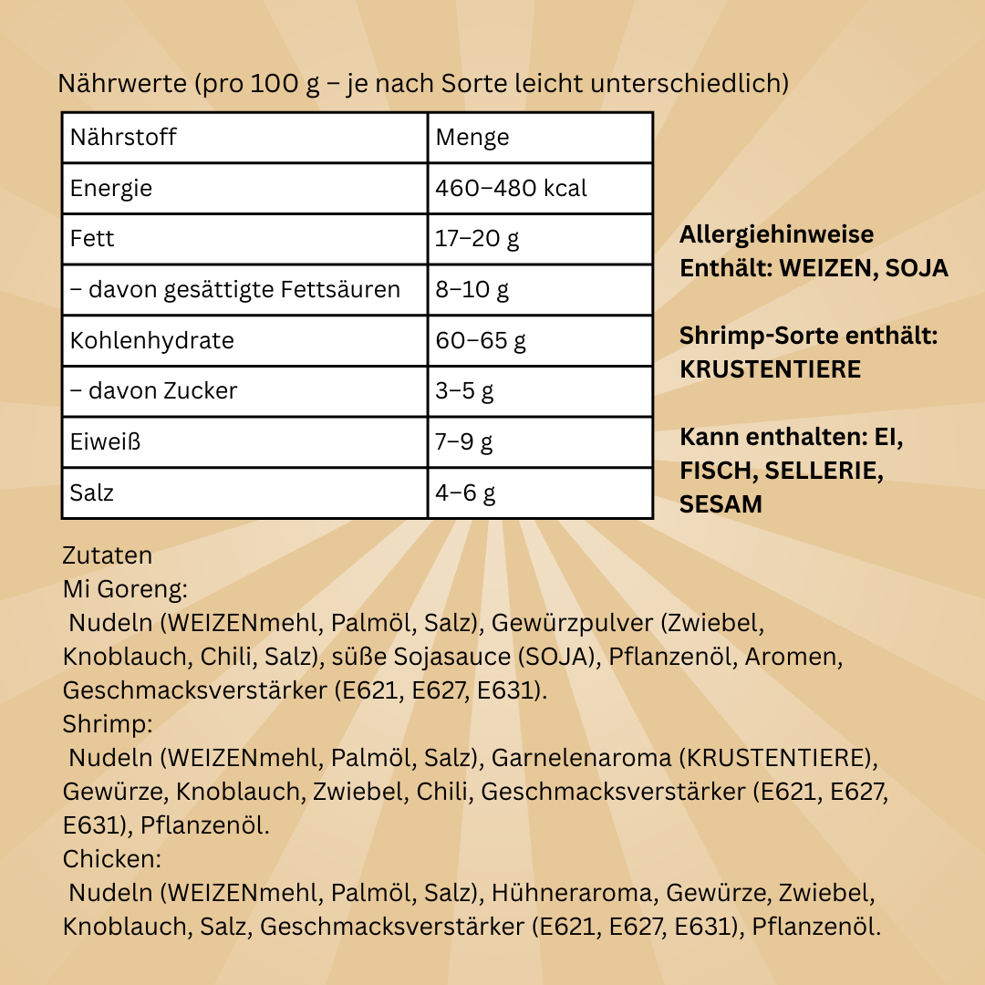 🍜 Drei beliebte Sorten – Mi Goreng, Shrimp & Chicken