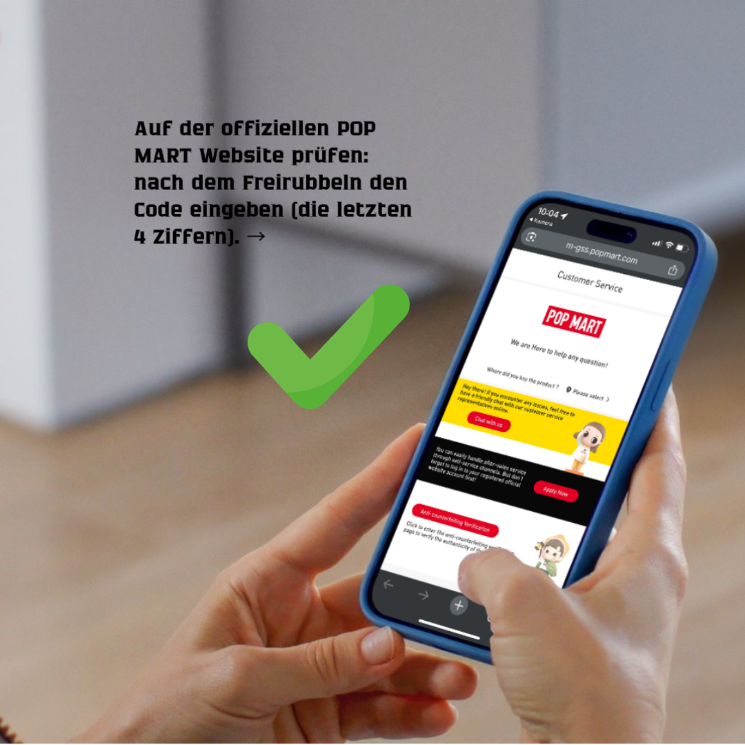 Jede Box hat einen aufgedruckten QR-Code mit Freirubbel-Schicht → auf der offiziellen POP MART Website prüfen, Eingabe der letzten 4 Ziffern