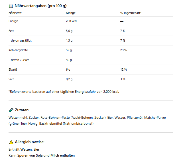 Weizenmehl, Zucker, Rote-Bohnen-Paste (Azuki-Bohnen, Zucker), Eier, Wasser, Pflanzenöl, Matcha-Pulver (grüner Tee), Honig, Backtriebmittel (Natriumbicarbonat)