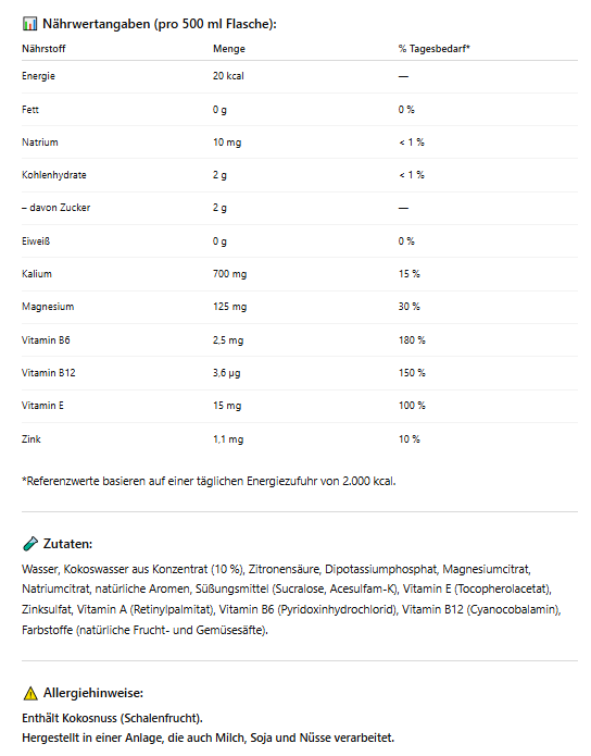🥥 10 % Kokoswasser: Natürliche Quelle für schnelle Flüssigkeitsaufnahme.
