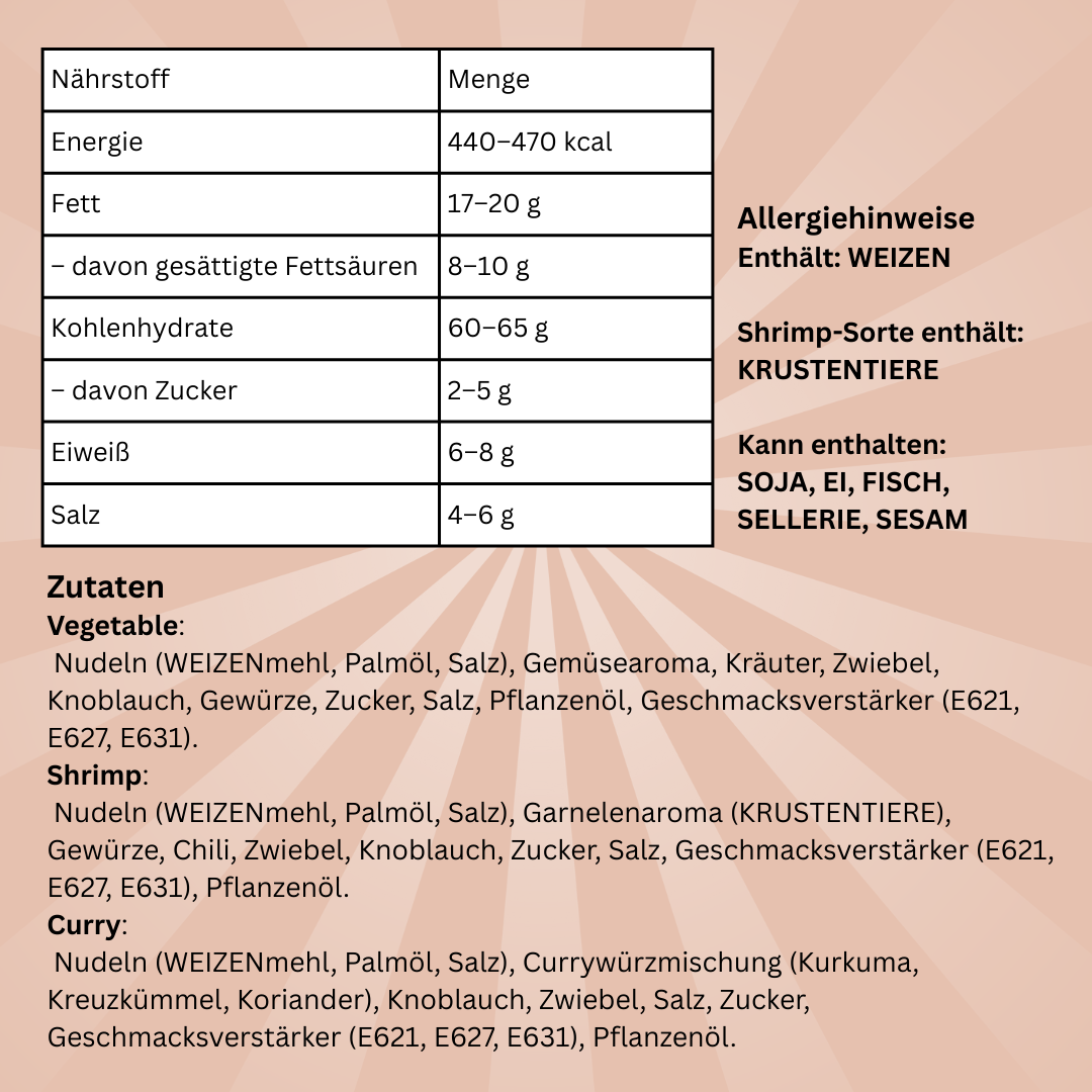 🍜 Drei beliebte Sorten – Vegetable, Shrimp & Curry